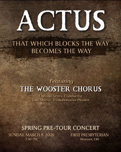 Join the Wooster Chorus this Sunday, March 8, at 7:30 p.m. at First Presbyterian Church as they present their Spring Pre-Tour Concert entitled, ACTUS. The program draws inspiration from an ancient aphorism attributed to the Roman emperor and Stoic philosopher Marcus Aurelius: “That which blocks the way becomes the way.” Through thought-provoking music exploring adversity, hope, and the courage to move forward, the program ACTUS reminds us that the obstacles we face may become the very path that shapes us.
